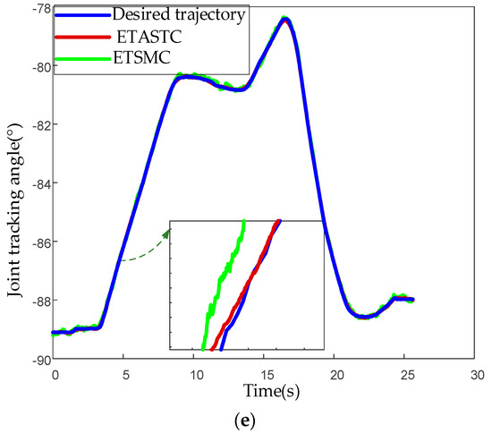 where and represent the desired joint angle and the actual joint angle, respectively. A comparison of the MAE of the two algorithms (ETASTC and ETSMC) in each joint is listed in Table 3.