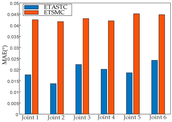 It can be seen from Table 3 that the MAE values of all joints of the ETASTC algorithm are significantly lower than those of ETSMC. The errors of the ETASTC algorithm for joints 1 and 6 are reduced by 58.5% and 45.9% compared to that of ETSMC, respectively. The average MAE error of the six joints shows that the proposed ETASTC algorithm is 54.9% more accurate than the comparison algorithm ETSMC. The MAE range of ETASTC (0.0137°–0.0242°) is narrower than that of ETSMC (0.0416°–0.0451°), indicating that its control strategy is more robust on different joints. By dynamically adjusting the sliding mode gain and disturbance compensation term, ETASTC effectively suppresses the chattering problem of the traditional sliding mode, thus reducing the MAE. The MAE results of the trajectory tracking of the different algorithms on a 6-DOF robot manipulator are shown in Figure 11.
