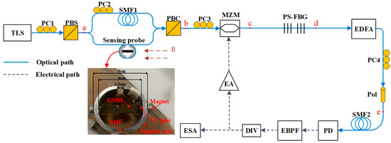 - Sun, W.; Liu, X.; Deng, M. High-Precision Magnetic Field Sensor Based on Fiber Bragg Grating and Dual-Loop Optoelectronic Oscillator. Photonic Sens. 2022, 12, 220419. [Google Scholar] [CrossRef]