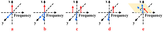 In the OEO loop, when light propagates through the MZI to the MZM, it is necessary to adjust the DC bias of the MZM to the minimum transmission point in order to achieve carrier-suppressed double sideband (CS-DSB) modulation. The modulation method requires a fixed phase difference of ‘’ to be introduced between the upper and lower arms of the MZM to ensure that the optical carrier is suppressed while the ±1st-order sidebands are enhanced, which is critical for high-quality beat signal generation in the OEO system. At point c, owing to the polarization-dependent property of the MZM, ±1st-order sidebands and an optical carrier with orthogonal polarization relationships are generated, as illustrated in Figure 2c. The phase shift between the optical carrier and sidebands corresponds to the magnetostrictive phase difference in the two arms of the MZI. At point d, +1st-order sideband and the optical carrier, which possess mutually orthogonal polarization relationships, are retained after being filtered by a PS-FBG. If the PC4 adjusts the polarization direction of its emitted light at a 45° angle to the principal axis of Pol, the interference signal at point e can be written as: