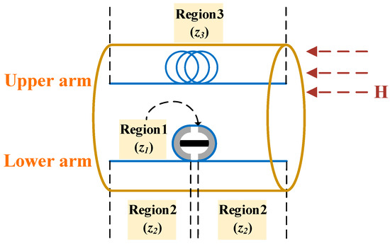 The design of the sensing component in the temperature-compensated magnetic field sensor is depicted in Figure 3. Inside the solenoid, optical fibers utilized for detecting the magnetic field are categorized into distinct regions. The fibers in Region 2 and 3 remain unmodified and are only sensitive to ambient temperature changes, serving as a reference for temperature compensation, with no response to variations in the magnetic field. In contrast, the fiber in Region 1 is wound around a magnetostrictive transducer made of the GMM. When exposed to the magnetic field, the GMM undergoes magnetostrictive deformation, which induces strain in the fiber wound around two supporting arms and altering its length and refractive index. Consequently, the optical fiber situated in Region 1 exhibits sensitivity to variations in both magnetic field and temperature. When the ambient temperature or magnetic field in the Region i (where i = 1, 2, 3) changes, the length of the fiber and effective refractive index will undergo corresponding changes, which can be represented as [22]: