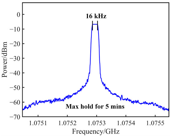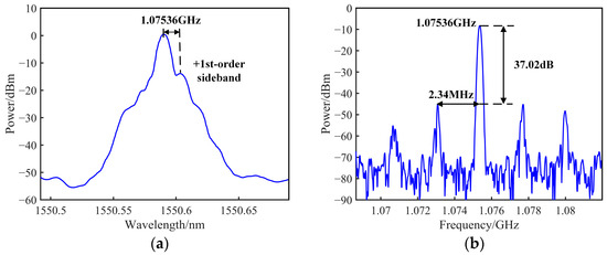 The optical spectrum measured at the Pol output using an OSA (YOKOGAWA, Tokyo, Japan, ANDO, AQ6370D) is depicted in Figure 4a after establishing the OEO feedback loop. Due to the filtering effect of the PS-FBG, the −1st-order sideband is suppressed, while the optical carrier and +1st-order sideband are retained. The oscillation signal measured in the OEO loop is a beat signal, resulting from the interference between the optical carrier and the +1st-order sideband. Meanwhile, Figure 4b displays the electrical spectrum of the corresponding OEO oscillating signal captured using an ESA (Agilent Technologies, Santa Clara, CA, USA, Agilent N9010A). The OEO system produces a microwave signal centered at 1.07536 GHz, exhibiting a side mode suppression ratio (SMSR) of 37.02 dB. Furthermore, the FSR of the OEO is determined to be 2.34 MHz, which corresponds to an OEO loop length of 88 m. The observed center frequency and FSR of the OEO oscillating signal in the experiment align closely with the theoretically derived results, validating the accuracy of the theoretical model and experimental setup.