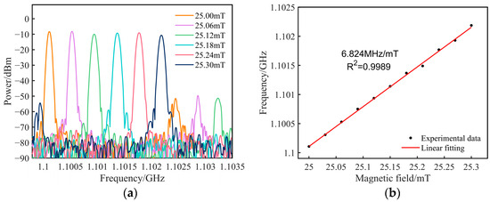 The sensing performance of the magnetic field sensor is evaluated. The untreated SMF and sensing component are placed within a solenoid, where the magnetic field intensity is influenced by variations in power supply current, and the direction of the magnetic field is parallel to the GMM. As depicted in Figure 6, when the magnetic field rises from 25.00 mT to 25.30 mT in steps of 0.06 mT, the OEO oscillating frequency linearly increases. Figure 6a shows the superposition spectrum of the oscillation signals as the magnetic field incrementally rises. The test data presented in Figure 6b are subjected to linear fitting, revealing a magnetic field sensitivity of 6.824 MHz/mT and a correlation coefficient (R2) of 0.9989. The frequency shift of this signal is directly proportional to the change in magnetic field, as demonstrated by the linear relationship shown in Figure 6b. This relationship is a key feature of the proposed sensor, enabling high-sensitivity magnetic field detection.
