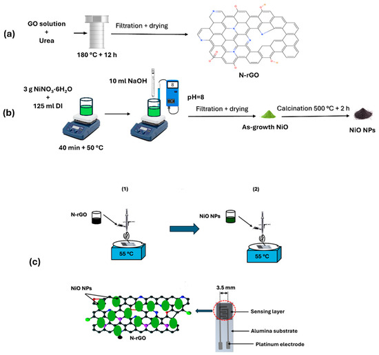 (a) Preparation of N-rGO and (b) NiO nanoparticles. (1) and (2) illustrate the airbrushing process used to coat the electrode area of the transducer substrate. (c) fabrication of the NiO/N-rGO sensor device.