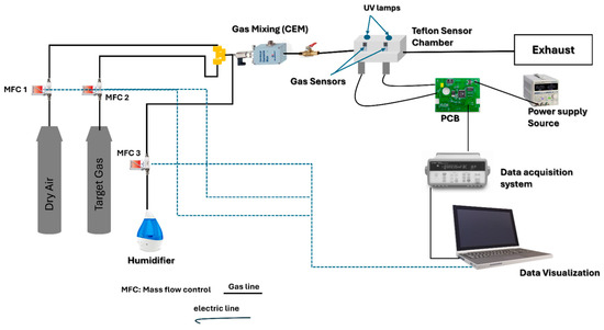 The sensor responses were recorded using an Agilent 34972A data acquisition system, which continuously monitored the resistance of the sensing materials during exposure to varying concentrations of target gases, including NO2, ethanol, NH3, and CO2. Additionally, the effect of humidity on sensor performance was assessed using a controller evaporator mixer (CEM) to generate a controlled humidity level of 70% RH, simulating real environmental conditions at the optimal operating temperature. The overall gas sensing measurement setup is illustrated in Figure 2.