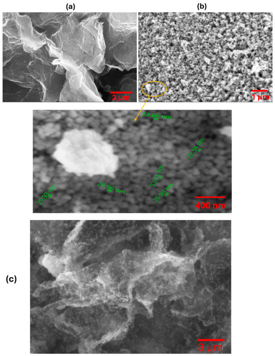 SEM micrographs provide detailed insights into the morphological characteristics of N-rGO and NiO NPs and NiO/N-rGO deposited film. As shown in Figure 3a, N-rGO exhibits a distinctive folded 2D graphene flake structure, reflecting the effects of the reduction and nitrogen doping processes [14]. The observed wrinkles and corrugations are likely due to the intercalation of nitrogen atoms within the graphene layers [9]. In contrast, the NiO surface, presented in Figure 3b, reveals a distribution of spherical nanoparticles with comparable sizes. Additional details on the size distribution of NiO nanoparticles are presented in the histogram shown in Figure S2 (Supplementary Information). Figure 3c confirms the successful attachment of the deposited NiO NPs onto N-rGO sensing film. This is further supported by TEM analysis results.