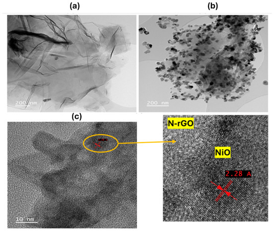 The HRTEM image in Figure 4a reveals the characteristic two-dimensional nanostructures of graphene, displaying thin, flake-like layers folded around darker regions. In contrast, Figure 4b,c illustrates the successful and uniform decoration of nickel oxide nanoparticles across the N-rGO surface. The NiO nanoparticles exhibit a nanocrystalline structure with an interplanar spacing of 2.28 Å, corresponding to the (200) plane. This spacing, slightly offset by approximately 0.2 nm compared to the standard value (ICDD card number: 73-1519), is attributed to lattice distortions induced by interactions with the N-rGO substrate, as confirmed by XRD analysis [30].