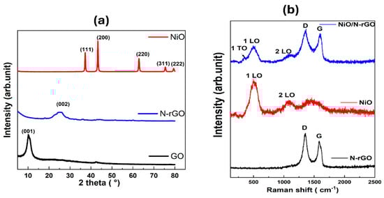 (a) XRD pattern of GO, N-rGO, and NiO. (b) Raman Spectra of N-rGO, NiO, and NiO/N-rGO.