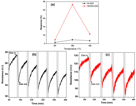 (a) Sensor responses as a function of their operating temperature toward 800 ppb of NO2. Dynamic response and recovery curves for repeated exposure cycles to 800 ppb NO2 for (b) N-rGO and (c) NiO/N-rGO. The sensor operating temperature was 100 °C.