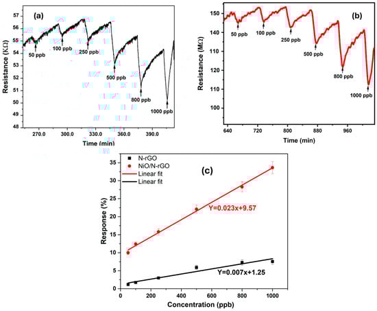 The dynamic resistance changes in the as-fabricated sensors were further recorded across a wide range of NO2 gas concentrations—50, 100, 250, 500, 800, and 1000 ppb—at an operating temperature of 100 °C, as illustrated in Figure 7a,b. The calculated responses for the N-rGO sensor were 1.18%, 1.75%, 3%, 5.9%, 7.28%, and 7.56%, respectively, while the NiO/N-rGO sensor demonstrated responses of 10%, 12.42%, 15.8%, 22.1%, 28.25%, and 33.63%, respectively. Both sensors exhibited stable and reproducible sensing responses, as evidenced by their small standard deviation errors on the order of 10−4 [42].