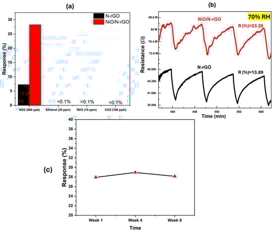 Ambient moisture interference is a critical parameter in evaluating the sensitivity of gas sensors under working conditions. To investigate this, the prepared sensors were tested in a highly humid environment (70% RH) at 100 °C, alongside an 800 ppb NO2 concentration. As shown in Figure 8b, the N-rGO sensor exhibited an increased response to ambient moisture, rising from 7.28% under dry conditions to 13.89% at 70% RH. In contrast, the NiO/N-rGO sensor showed a decreased response in the humid environment compared to its dry condition response of 23.26%.