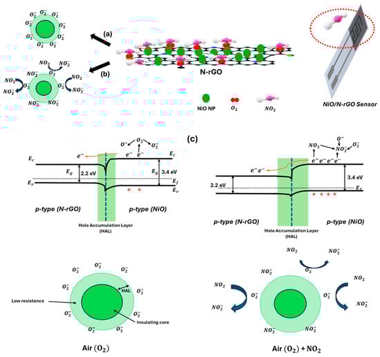 Formation of core–shell structures of charge carriers in NiO to (a) air (O2), (b) NO2, and (c) the sensing mechanism of NiO/N-rGO sensitivity to NO2 at 100 °C. At the interface between p-type N-rGO and p-type NiO, a Hole Accumulation Layer (HAL) forms in both cases under air or in the presence of NO2.