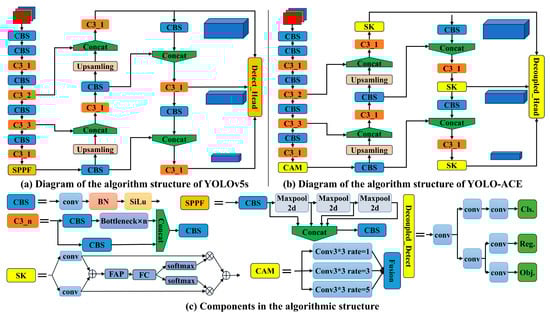 (a) Diagram of the algorithm structure of YOLOv5s; (b) diagram of the algorithm of YOLO-ACE; (c) components in the algorithmic structure.
