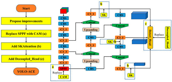 Figure 2 presents a flowchart that visually demonstrates the integration process of the modules within the YOLO-ACE architecture. This diagram delineates the sequential operations, illustrating how the CAM replaces the SPPF module, how SKAttention is incorporated into the neck, and how the decoupled head substitutes the standard YOLO head.