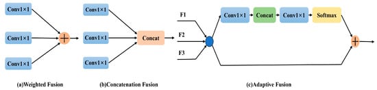 In further detail, CAM offers three distinct feature fusion strategies—labeled (a), (b), and (c)—shown in Figure 4. Methods (a) and (b) employ weighting and concatenation, respectively, for direct integration of feature maps across spatial and channel dimensions. In contrast, method (c) introduces an adaptive fusion scheme by combining convolution, splicing, and softmax operations. This adaptive scheme dynamically merges contextual information from three separate input channels, producing a refined output that heightens sensitivity to subtle target features. A comprehensive evaluation of these strategies is provided in the experimental section, underscoring CAM’s role in augmenting feature extraction, a core tenet of the “A” in YOLO-ACE.