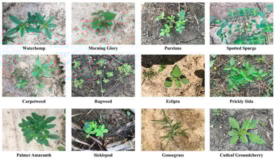 A comprehensive cotton weed dataset, featuring 15 weed classes from cotton fields in the United States and comprising a total of 5187 images, was recently introduced []. Thirty-five cutting-edge deep learning models were assessed through transfer learning and applied for weed classification, achieving an accuracy of over 95%. This dataset was confined to the classification task alone, owing to the absence of bounding box annotations for weed boundaries. Dang et al. introduced a novel dataset named CottonWeedDet12, comprising 5648 images across 12 weed classes, complete with bounding box annotations. Upon evaluating 25 YOLO object detectors using this dataset, they discovered that YOLOv4 attained the highest detection accuracy, while YOLOv5s offered the optimal balance of detection accuracy and speed []. Given that this dataset not only encompasses data on various weed types and a public collection of bounding boxes but also serves as a benchmark for weed detection across the YOLO model series, selecting this dataset is more pertinent. On one hand, it circumvents the necessity of collecting and labeling the data, allowing for greater focus on enhancing model performance; on the other hand, CottonWeeddet12, as a publicly available dataset for weed detection, facilitates more comprehensive testing of the model’s capabilities and contributes significantly to future weed detection and identification efforts. Consequently, this dataset has been selected for use in this study to achieve efficient cotton weed detection. Figure 6 presents an example of the 12 weed classes featured in this dataset. Most images in CottonWeedDet12 are high-resolution, typically exceeding 1000 pixels in at least one dimension—for instance, some images are around 3024 × 2032. We split the dataset into training, validation, and testing sets with a 7:2:1 ratio, ensuring a balanced and comprehensive evaluation of our model. In addition, we employed multiple data augmentation strategies—such as mosaic, random flipping, and HSV (hue, saturation, value) adjustments—to enhance the robustness and generalizability of our model.