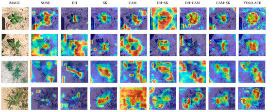 To further assess the interpretability and localized focus of these enhancements, we utilized Grad-CAM++ [] to generate heatmaps highlighting the regions most influential in the model’s decision-making process. Figure 9 shows that incorporating the CAM, SKAttention, and the decoupled detection head leads to more precise emphasis on weed regions. Notably, the full combination of all three modules demonstrates the highest concentration on target weeds and the least background confusion, thereby offering a clearer insight into how YOLO-ACE makes detection decisions. This comprehensive visualization indicates that each module not only contributes to performance gains but also improves model interpretability in real-world cotton field scenarios.