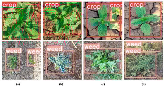 Additionally, we discussed the robustness of the model under different lighting conditions and viewpoints, demonstrating its ability to effectively detect weeds under these variations. As shown in Figure 10, we present the detection results under varying lighting conditions and viewpoints, where both sesame crops and weeds are effectively detected. Overall, these experiments highlight YOLO-ACE’s significant potential in field weed detection and emphasize its practical advantages for large-scale agricultural applications.