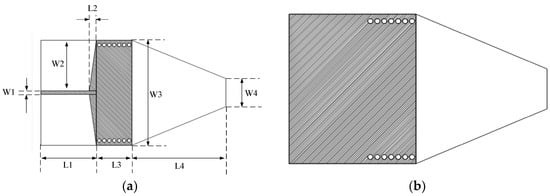 The 3D view of the antenna without the GSG structure is also shown in Figure 1b. In order to clearly describe the topology of the antenna, the top view and bottom view of the antenna are also shown in Figure 2a,b. In Figure 1b and Figure 2a,b, the shaded part is metal copper, while the other remaining part is Rogers 4350.