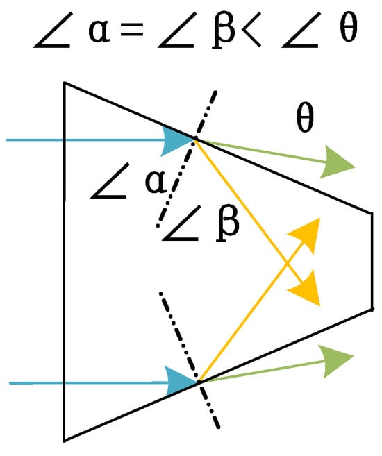 The permittivity of the dielectric Rogers 4350 is greater than air. At the interface of Rogers 4350 and the air, RF signals obey Snell’s laws of reflection and refraction; therefore, RF signals tend to focus rather than diverge when it is radiating through the tapered dielectric rod, and this is also another theoretical foundation for this end-fire rod antenna. Figure 5 shows the reflection and refraction of parallel light passing through the trapezoid (the model in Figure 5 is not accurate when the dimensions are close to the wavelength, but it can provide a more intuitive understanding). The blue arrows represent the parallel RF energy flow, the yellow arrows represent the reflected waves, and the green arrows represent the refracted waves. According to Snell’s laws of reflection and refraction, regardless of whether they are reflected or refracted, such waves tend to concentrate and focus compared with the input parallel waves. For triangular and curved rods, the principles are similar.