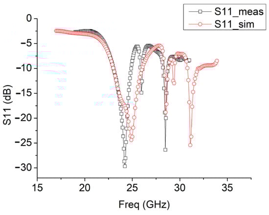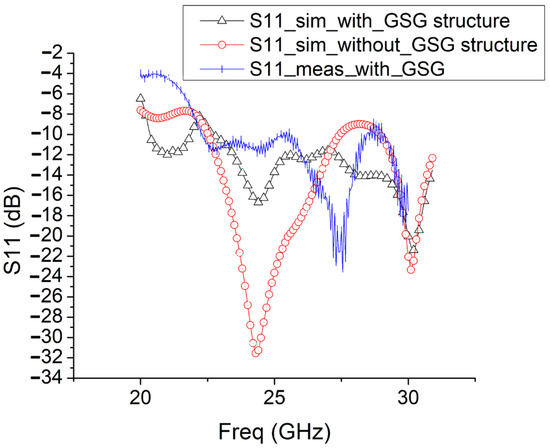 The input GSG structure affects S11 performance a lot. Therefore, in Figure 9, the S11 simulation results with/without the new GSG structure are both shown. And the measured S11 with the new GSG structure is also shown. Compared with the S11 simulation results with/without the input GSG structure, the resonance frequency shifted from 24 GHz to around 27.5 GHz. This might be due to the inclusion of the end-launch connector in the measurement.