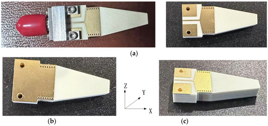 (a) Top view, (b) bottom view, and (c) side view of the prototype of the end-fire rod antenna during the first fabrication (the coordinate X-Y-Z axis is also shown in (c)).