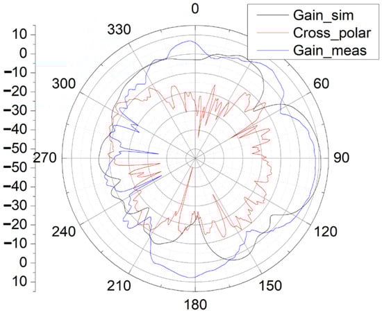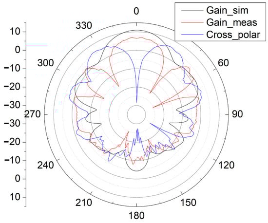 The cross-polarization pattern is also included in Figure 10 and Figure 11. The measured cross-polarization is smaller than −30 dB in both x-y and x-z planes.