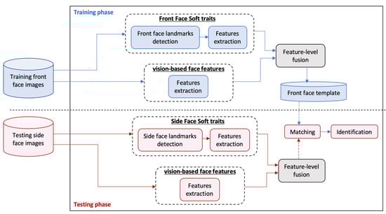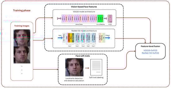 In biometric systems, fusion approaches are frequently divided into four levels: decision, score, rank, and feature [55]. These approaches can improve the accuracy, robustness, and dependability of the system as a whole by combining various biometric inputs. Such fusions could provide a more reliable and thorough identification by combining data from several biometric process stages [56]. In our system, feature-level fusion is implemented to combine the traditional/hard and the proposed semantic/soft features. We synthesize a single feature vector through the combination of discriminative information from several feature sources since it is simple and frequently used for augmenting performance. Figure 8 is a partial focus on the proposed framework that displays the detailed feature extraction and fusion processes during the training phase.