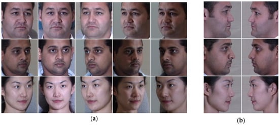 Samples from the CMU Multi-PIE dataset, where (a) front face samples of training images of different angles; (b) samples of testing images represent right side α = +90° and left side α = −90°.