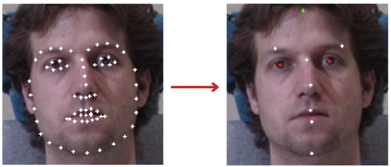 Before extracting the soft biometric features, the desired facial landmarks need to be first detected. Face landmark detection is a fundamental technique in computer vision that refers to the process of locating significant facial features and adding key points to them [26]. These important key points, referred to as landmarks, include many facial features such as facial contours, lip borders, nose tips, corners of the eyes, etc. By marking these landmarks, a wide range of eventual tasks can be fulfilled, including facial recognition, emotion recognition, facial analysis, and augmented reality applications. In this research, for the training phase, we use the Dlib library’s pre-trained facial landmark detector to locate 68 (x, y)-coordinates corresponding to facial features on the front face [27]. This library is primarily developed to detect the front-face components in multiple poses. After applying it to the 800 training images, the Dlib successfully accepts 738 images as front faces and rejects the others to be excluded from the training subset, as summarized in the data distribution shown in Table 1. According to our proposed soft traits, we need a specific landmarks list along with additional new key points for the forehead and eye pupils automatically detected as shown in Figure 4, where the added new forehead and pupil key points are highlighted in green and red, respectively.
