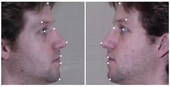 For the testing phase, to the best of our knowledge, no available ready-made and ideally applicable models to our need for detecting side face landmarks. Therefore, based on the same location of Dlib front landmarks, we apply further manual key points annotation to the side faces. Figure 5 shows the applied manual side-face annotation, which is a common technique in computer vision and machine learning fields to provide labeled datasets for validation and investigation purposes. We utilize the RectLabel tool since it provides an easy-to-use interface that enables the annotation of images. It provides the capabilities for managing, organizing, and altering annotations in addition to supporting several picture formats [28]. The labels are saved in extensible markup language (XML) file format, each file contains the (x, y)-coordinates of the side face landmarks. The tool also facilitates the usage of labeled data in model training pipelines by integrating with popular machine learning frameworks and being compatible with macOS, as per the machine used in the current experimental work.