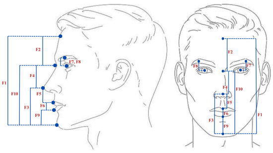 Here, we propose 33 anthropometric-based soft face traits that are easily understood and automatically extracted, divided into 10 facial distances and 23 facial ratios. To bridge the front and side face views, we focus on the vertical distance traits, which can be invariant and immune to changes from front to side as shown in Table 2. Moreover, the positions of the 10 facial distances (features F1–F10) are illustrated in Figure 6. After extracting these 10 distances, we take the relative proportions between them to derive 23 new ratios. In anthropometry, the facial measurements are directly measured in millimeters or centimeters [31,32]. In our system, each distance trait is first detected by the facial landmarks approach [33]. Then, for each trait, we calculate the Euclidean distance between the facial key points to determine the most appropriate corresponding (relative) semantic label automatically [34]. All 33 traits are semantically labeled using a bipolar five-point scale [very large—large—medium—small—very small] as ordinal attributes. In order to assign applicable labels for distance traits, we take into consideration the following aspects: calculating the mean Euclidean distance for each trait and then comparing each distance value within the same trait to its corresponding mean distance. After that comparison, we assign the semantic labels in relative form as follows: “very large” (the value is larger than the mean, within a range larger than +5 units per Euclidean distance), “large” (the value is larger than the mean, within a range between +2 and +5), “medium” (the value is equal or close to the mean, within a range of ± 2), “small” (the value is smaller than the mean, within a range between −2 and −5), “very small” (the value is smaller than the mean, within a range smaller than −5). After extracting distance values, we infer the proportions for the 23 ratio traits (features F11–F33), as elaborated in Table 3. These facial ratio traits are fractional numbers; thus, we use the percentile to determine the labels to be assigned [35]. The percentile formula is: