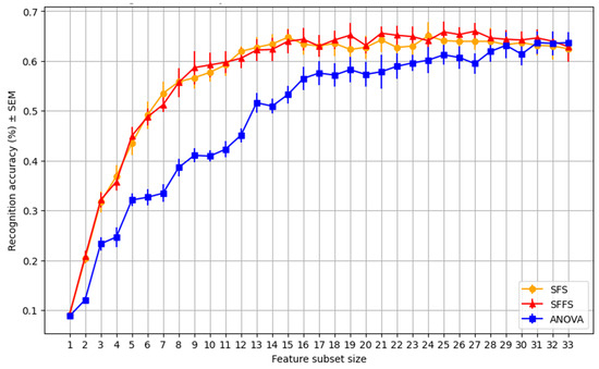 This process aims to analyze and investigate the feasibility of enforcing an effective feature subset selection method on the proposed face soft traits. This way, a feature subset can be nominated, comprising the most substantial features that contribute most to the recognition task and potentially achieve increased performance with minimal features. We use sequential forward selection (SFS) and sequential floating forward selection (SFFS) to evaluate the feature subsets in recognition [42,43]. SFS moves forward by only pursuing the best-performing feature among the remaining features. As a result, the chosen subset size increases as long as adding any new feature from the yet unselected ones improves performance. The forward SFS and sequential backward selection (SBS) are combined in the SFFS algorithm. By adding the retracing step in the backward direction, SBS improves upon SFS in terms of search performance. This stage of backtracking aids in removing a trait that reduces learning effectiveness. The enhancement is performed during the selection process, making it a conditional phase. Figure 7 shows the significance assessment of selecting features during the recognition task in isolation (as the only used features). The feature subset selection procedure shows a trend of growth in structural equation modeling (SEM) scores, as pertinent features are added one at a time. The SEM graphical representation illustrates how feature addition affects the model’s overall performance [44]. The resulting curves show that employing a selection of 15–20 soft traits yields the best SFS performance. Additionally, SFFS reaches its highest level in the 19–21 subset and remains steady when more traits are added afterward. Furthermore, the ANOVA ordering by F-ratio, as feature subset selection, offers a curve that indicates slower growth and better performance when all 33 soft traits are used. Note that further extended experiments are conducted, as in Section 4, to determine the effectiveness of these selections when combined with the hard features.