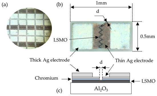 For the manufacturing process, the LSMO films deposited on the substrate were formed by using photolithography and chemical etching. Electrodes were then produced by thermally depositing layers of chromium and silver from the gas phase. This process took place in two stages. First, the 20 nm thick Cr layer was deposited to ensure good adhesion between the electrodes and the film, and then a 0.5 μm thick Ag layer was deposited and annealed for 1 h at 450 °C in an Ar atmosphere. The distance d between these electrodes was chosen in the range of 5–10 μm (depending on the resistivity of the films) to ensure the resistance of the sample of approximately 500 Ω. For soldering the connecting wires to the sensors, the second silver layer with a thickness of approximately 2 μm was deposited and annealed. Finally, the substrates with the films were cut into sensors with a size of 1 × 0.5 mm2. The structure and dimensions of the sensor are shown in Figure 2.