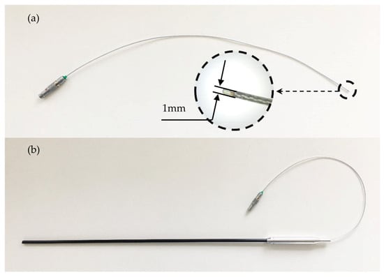 (a) Flexible magnetic field probe with length of 25 cm and wire diameter of 1 mm. (b) Rigid magnetic field probe in plastic housing with diameter of 3 mm.