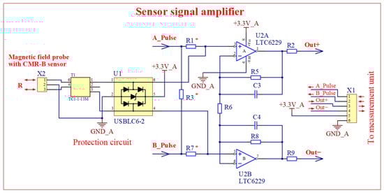 A circuit diagram of the sensor’s signal amplifier is presented in Figure 5. It consists of two parts: the amplifier itself and the interference protection circuit U1 that protects against interference surges. The sensor signal enters the interference protection circuit through a transformer T1, from which it is transmitted to the amplifier. Resistors R1* and R7* are used to adjust the output signal levels of operational amplifiers U2A and U2B for the ADC (maximum input voltage of ADC is 1.875 V, minimum—0.625 V). The value of the voltage across the sensor and its change under the influence of a magnetic field depend on the ratio between the sensor’s resistance, the reference resistors R1* and R7*, and the resistors connected in parallel to the sensor R3*. When selecting the values of these resistors, it is necessary to take into account the maximum allowed input voltage of the operational amplifiers. In addition, it is known that the magnetic field reduces the sensor resistance, but when the measurement temperature decreases, the sensor resistance and voltage increase, which can lead to the saturation of the amplifiers. The main advantage of a magnetic field meter with a sensor signal amplifier that is a separate block close to the sensor is the ability to transmit the amplified signal over a relatively long distance without distortion. The main disadvantage of this solution is that the greater the distance between the main unit and the amplifier, the more complicated the synchronization, which reduces the measurement accuracy.