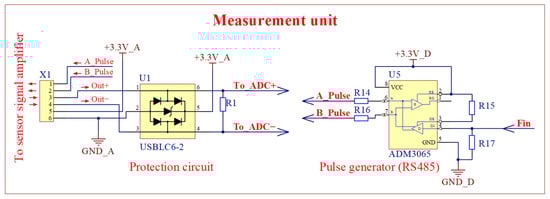 The remaining parts of the meter are placed in another block, including a bipolar pulsed voltage supply, an interference protection circuit, an ADC, a microcontroller, a USB, and fiber optic interfaces for the computer (Figure 4). The circuit diagrams of the interference protection circuit and bipolar pulsed voltage supply source are presented in Figure 6. Interference protection circuit U1 is used to limit interference surges that occur on the communication line between blocks. The analog signal received from the sensor signal amplifier was converted to the digital one by the 16 bit 25 MS/s ADC and sent to the microcontroller (LPC54606J256BD100E, NXP USA Inc., Austin, TX, USA) for further processing according to Equation (1). The bipolar voltage pulses required for the sensor supply are generated by a specialized RS485 (Texas Instruments, Dallas, TX, USA) generator circuit U5. The frequency of the pulsed voltage is controlled by the microcontroller.