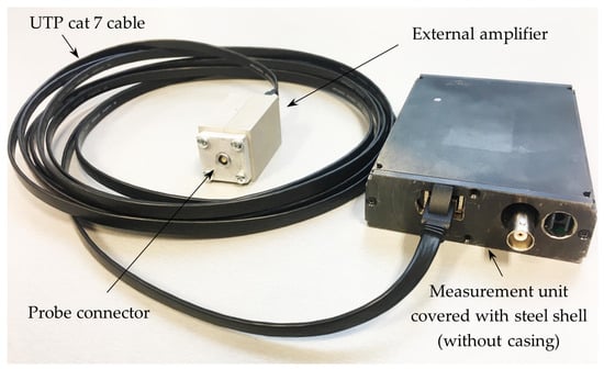 A picture of the first version of the magnetic field meter is presented in Figure 7. The meter’s measurement unit is shielded with a 5 mm thick steel shell and connected to a separate amplifier unit via a UTP Cat 7 cable (Belden Wire & Cable B.V., Venlo, The Netherlands). The steel shell is used to suppress external interference that could affect the operation of the measuring device. In the final version, the measurement unit is housed in an aluminum casing. In this version of the meter, the amplifier unit is designed as a separate block that can be positioned close to the sensor (to the measuring location) when the measurement unit is further away. This design offers the advantage that the meter can be used when it is not possible to place the measurement unit close to the measurement object. In addition, studies have shown that this version does not require very precise matching of reference resistors to the sensor resistance. Therefore, the magnetic field sensors with resistance in the range from 500 Ω to 1.5 kΩ can be used in this version of the meter.