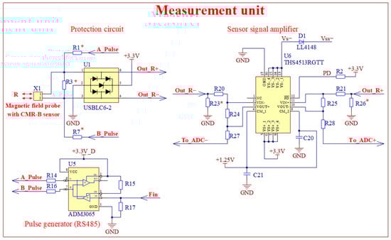 The magnetic field sensor’s signal is fed to the integrated circuit U1 (USLBC6-2, STMicroelectronics, Geneva, Switzerland), which is designed to protect the sensor signal amplifiers from overvoltage (Figure 9). The output signal from U1 (Out R+ and Out R−) is transmitted to the sensor signal amplifier U6 (operational amplifier THS4513RGTT, Texas Instruments, Dallas, TX, USA). This amplifier is characterized by a very low noise level of 2.2 nV/Hz and a fast response time of 2.9 ns. This allows for the high suppression of common interference that affects the magnetic field sensor and the cable connecting it to the magnetic field meter. In addition, this circuit allows the signal to be amplified with extremely low intermodulation distortion, suppressing common-mode parasitic signals up to 90 dB. The output signals from U6 (To_ADC+ and To_ADC−) are transmitted to a 16-bit ADC. As in the first circuit, the magnetic field sensor is powered by a pulsed bipolar voltage generated by the circuit U5 (ADM3065, Analog Devices Inc. Wilmington, MA, USA). As we can see in this circuit, a resistor R3* is connected in parallel to the sensor, the function of which is to reduce the magnetic field probe impedance. This allows us to shorten the duration of the pulse edges, but at the same time reduce the sensitivity of the sensor. This sensitivity reduction can be compensated by changing the sensor signal amplifier’s gain.