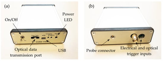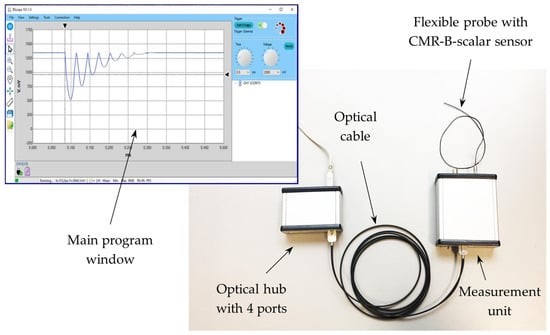 The picture of the second version of the measurement unit of magnetic field meter is shown in Figure 10. It is shielded with a steel shell and covered with an aluminum casing. The power switch, optic fiber connection port, USB port, and battery charge indicator are located on the front panel of the meter. The rear panel of the meter contains a LEMO connector for plug-in of the probe and synchronization connectors (optical and electrical) for receiving an external signal from a trigger. The trigger signal determines the start time of data recording into the meter buffer. A four-pin LEMO connector provides a reliable and fast probe connection, ensuring high signal quality, environmental resistance, and durability, making it ideal for use in complex measurement systems. A view of the magnetic field meter with the probe and a main window of the personal computer interface are presented in Figure 11.