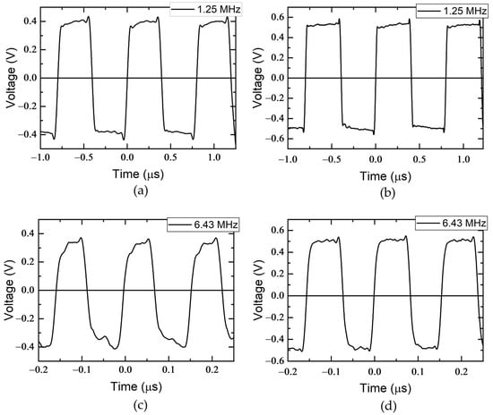 The shape of the bipolar pulsed supply voltage across the sensor was investigated for both versions of the magnetic field meter. The investigation was conducted at pulsed voltage frequencies of 1.25 MHz and 6.43 MHz. The resulting pulses are shown in Figure 12. It can be observed that the first version of the magnetic field meter has a stronger distortion at the leading and falling edges of the voltage waveform across the sensor, and the rise and fall times of the pulse are 20 ns and 18 ns, respectively. This can be attributed to the higher impedance of the longer cable, including the increased resistance, inductance, and capacitance distorting the signal. In addition, the longer cable is more susceptible to electromagnetic interference (EMI) and can cause signal reflections due to impedance mismatch. These factors combine to distort the quality of the bipolar square wave voltage, while the shorter cable minimizes these effects and preserves signal integrity. The advantage of the first measuring system, however, is the possibility of placing the measuring module far away from the source of the magnetic field. In the second version, the rise and fall times of the voltage pulses are shorter and correspond to 14 ns and 16 ns, respectively.