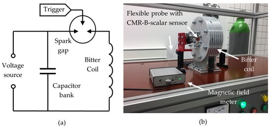 Recent advances in sensor technology have opened up new possibilities to overcome the limitations of conventional sensors. One notable innovation is the development of CMR-B scalar sensors based on the effect of colossal magnetoresistance (CMR) [] in polycrystalline manganite films (La-Sr-Mn-O) [,]. These sensors offer several advantages for the measurement of pulsed magnetic fields. They are direction-independent, compact and can operate in small volumes. In contrast to direction-dependent sensors, CMR-B scalar sensors do not need to be precisely aligned with the magnetic field, simplifying their installation in experimental setups. They have been successfully used to measure magnetic field distributions in railguns and coilguns, as well as during magnetic pulse welding and pulsed field magnets with amplitudes in the megagauss range [,,].