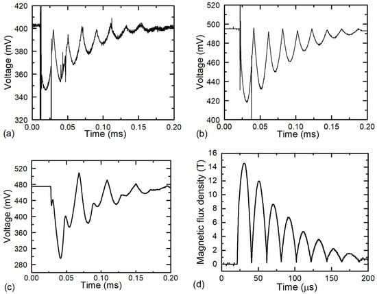 Transients of sensor signal using first (a) and second (b) versions of magnetic field meter, when sensors are placed in a Bitter coil and magnetic pulse generator capacitors are discharged through it when the capacitors’ voltage is 12.5 kV. (c) Transients of sensor signal are detected when useful signal, and EMF is also detected. (d) Magnetic flux density in the Bitter coil as a function of time, measured with the second version of the magnetic field meter when the capacitors were charged to 12.5 kV.