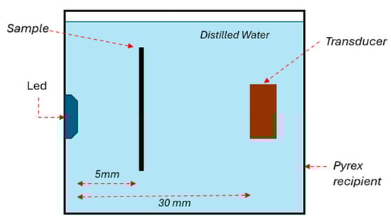The excitation source was the same LED used in previous tests, secured to one of the recipient’s inner surfaces and sealed with cold silicone. This sealing prevented contact between the LED’s cables and pads with the water, reducing the potential for signal noise. The transducer was positioned at the same height as the LED, aligned with a 30 mm separation.