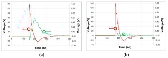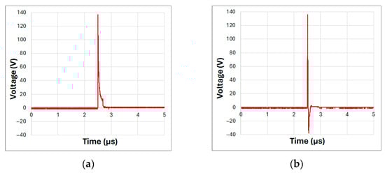These results validate the oscillator circuit’s reliable operation and its capability to generate high-intensity pulses with short durations, demonstrating its suitability for the intended application. Subsequent tests were conducted using a 150 V DC power supply, with the transistor discharge controlled by short pulses. To improve the control over the generated pulses, an external 1 V pulse was used. This external pulse allows for more precise control of the pulse generation, enabling easier management of the averaging process, metrics, and post-processing. By synchronizing the pulse with the system, control over the oscillation frequency and data consistency is significantly improved, facilitating more accurate analysis and measurements.