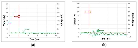 Figure 8a, the membrane was not included in the test, and the red line represents the electrical signal from the oscillator, while the green line shows the TIA output voltage from the microphone. A short-duration peak with an amplitude of up to 1.6 V is observed, caused by electromagnetic interference during the electrical pulse. However, this peak is unrelated to the recorded acoustic signal. As expected, no acoustic response is observed, as the light intensity was insufficient to excite any casing material at that distance, and no membrane material was present.