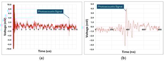 Figure 9a shows the full duration of the measurement, including the initial emission pulse, which generates electrical noise captured by the system. This range also importantly encompasses the subsequent acoustic signal detected by the transducer after the LED light pulse excited the sample.