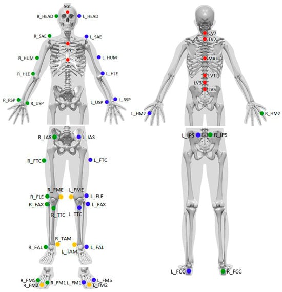 Gait analysis was conducted using the optoelectric Motion Capture System (Qualisys AB, Göteborg, Sweden), which was equipped with 12 Oqus 7+ cameras strategically positioned around the testing area to ensure comprehensive data acquisition. Reflective markers were placed directly on the participants’ skin following the standardized “Qualisys PAF package: Instituti Ortopedici Rizzoli (IOR)” protocol. This protocol involves the placement of 49 reflective markers across the participants’ limbs and bodies, enabling a detailed assessment of whole-body kinematics during gait (Figure 1) [13,14,15]. The markers were placed on the following anatomical landmarks, with corresponding labels from Figure 1 in brackets: the glabella (SGL), just above both ears (L_HEAD, R_HEAD), the jugular notch of the sternum (SJN), the xiphisternal joint (SXS), spinous processes of C7 (CV7), Th2 (TV2), L1 (LV1), L3 (LV3), L5 (LV5), the vertebra at the inferior edge of the scapulae (MAI), the acromial edges (L_SAE, R_SAE), the lateral midpoint of the humeri (L_HUM, R_HUM), the lateral epicondyle of the humeri (L_HLE, R_HLE), the styloid processes of the radii (L_RSP, R_RSP) and ulnae (L_USP, R_USP), the base of the forefinger (L_HM2, R_HM2), the anterior and posterior superior iliac spines (L_IAS, R_IAS, L_IPS, R_IPS), the lateral side of the greater trochanter (L_FTC, R_FTC), the lateral and medial femoral epicondyles (L_FLE, R_FLE, L_FME, R_FME), the proximal tip of the fibular head (L_FAX, R_FAX), the most anterior border of the tibial tuberosity (L_TTC, R_TTC), the lateral and medial malleolar prominences (L_FAL, R_FAL, L_TAM, R_TAM), the Achilles tendon insertion on the calcaneus (L_FCC, R_FCC), and the dorsal margins of the first, second, and fifth metatarsal heads (L_FM1, R_FM1, L_FM2, R_FM2, L_FM5, R_FM5).