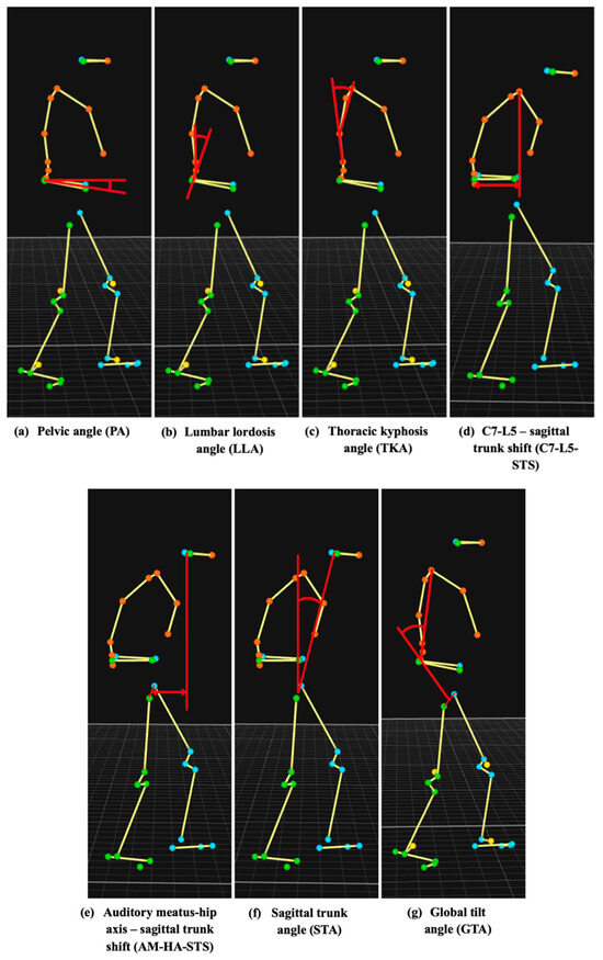 These measured parameters were selected to closely correspond with established spino-pelvic and sagittal balance parameters typically measured in X-ray imaging. Specifically, PA correlates with sacral slope (SS), LLA with lumbar lordosis (LL), TKA with thoracic kyphosis (TK), C7-L5-STS with sagittal vertical axis (SVA), AM-HA-STS with center of the auditory meatus to hip axis (CAM-HA), STA with odontoid hip axis (OD-HA), and GTA with global tilt (GT) [3,16,17].