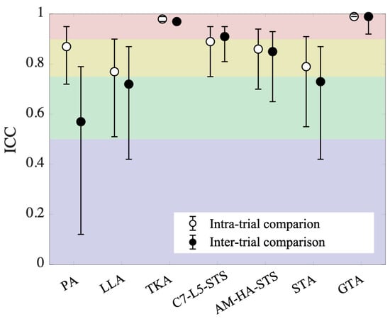 The test–retest reliability assessed across two trials (inter-trial comparison), as reflected in the intraclass correlation coefficient (ICC), is shown in Table 3. The ICC values for the inter-trial comparison (Table 3 and Figure 3) revealed moderate reliability for PA, LLA, and STA (0.57, 0.72, 0.73, respectively); good reliability for AM-HA-STS (0.85); and excellent reliability for TKA, C7-L5-STS, and GTA (0.97, 0.91, 0.99, respectively). The test–retest reliability within the same trial, assessed between two consecutive right or left steps (intra-trial comparison), as reflected in the ICC, is also reported in Table 3. The ICC values for intra-trial comparison (Table 3 and Figure 3) revealed good reliability for PA, LLA, C7-L5-STS, AM-HA-STS, and STA (0.87, 0.77, 0.89, 0.86, 0.79, respectively) and excellent reliability for TKA and GTA (0.98, 0.99, respectively).